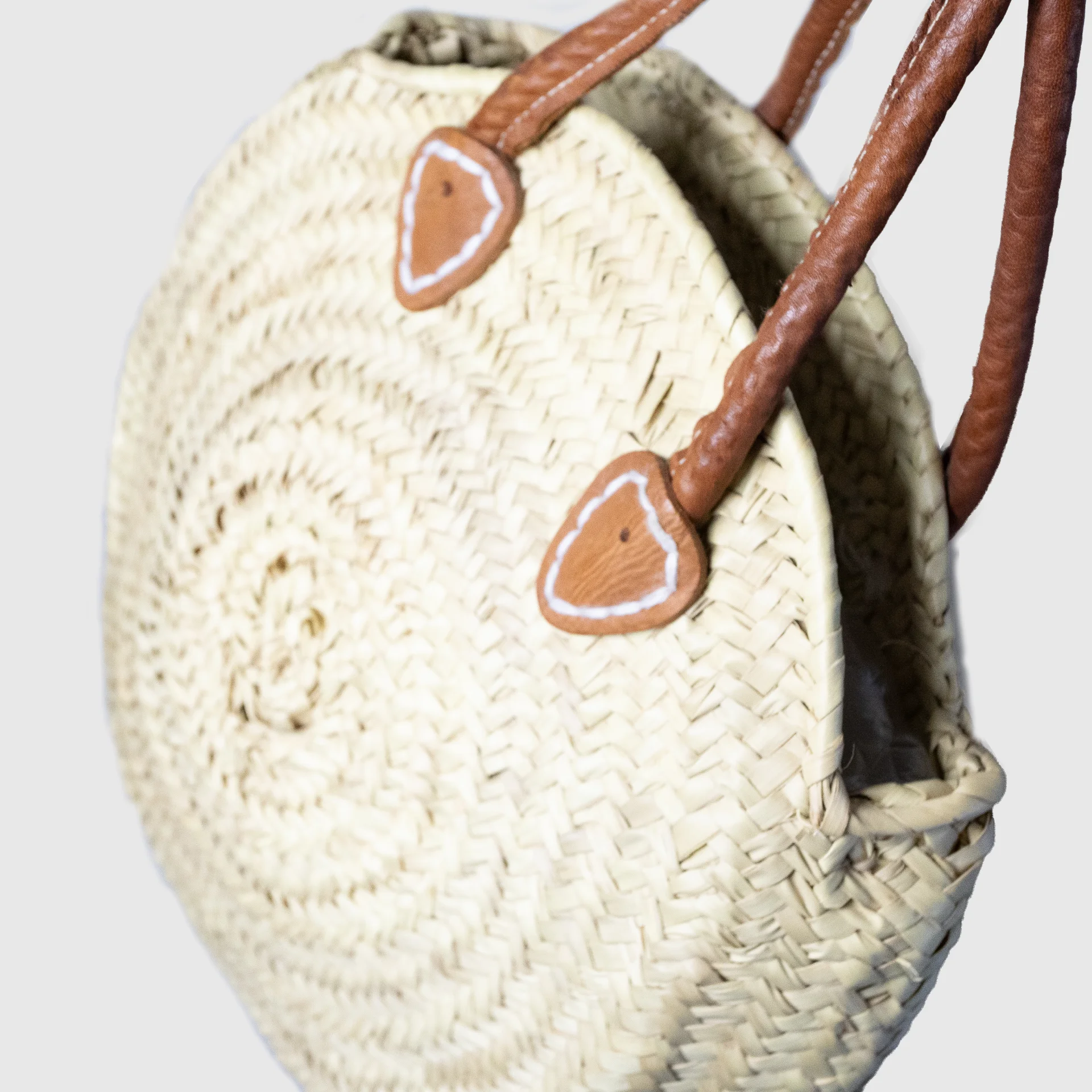Ronde handgemaakte leren & rieten handtas. Gemaakt van natuurlijke materialen.